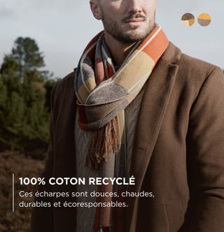 Cette écharpe est en 100% coton recyclé, avec un motif à carreaux marron et jaune. Sa trame apparente et ses franges nouées aux deux extrémités lui donnent une finition nette. Le tissu est doux et tombe bien sur manteaux et pulls.