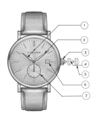 Régler l'heure Placez la couronne en position 5 et tournez. Régler la date Placez la couronne en position 4 et tournez dans le sens des aiguilles d'une montre.