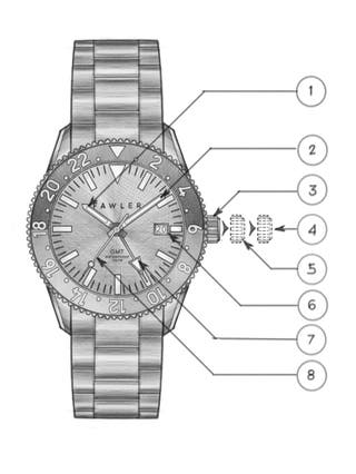 Régler l'heure GMT Mettez la couronne en position 5 et tournez-la dans le sens inverse des aiguilles d'une montre.