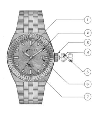 Régler l'heure: Mettre la couronne en position 5 et tourner. Définir la date: Mettre la couronne en position 4 et tourner.